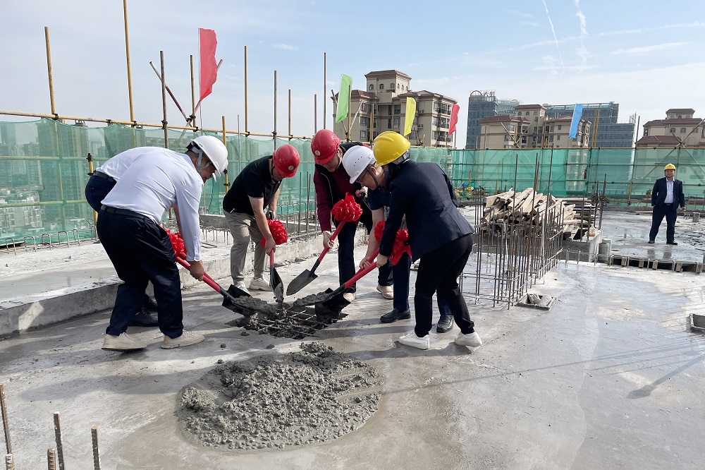9时18分,封顶仪式正式举行,戴学军及项目团队管理人员登上楼顶,‎共同将‎预拌混凝土铲‎入预留‎的钢筋方形槽‎中,寓意封顶大吉。随后,在进行切烧猪、派发红包、燃放鞭炮等一系列具有广东特色的风俗仪式后,‎封顶仪‎式正式‎宣告圆‎满成功‎。仪‎式结束‎后,在罗泽伟的陪同下,戴学军‎深入施工现‎场,了解工程建设完成情况,要求建设单位做好最后的收尾工作,确保下一阶段的施工有序推进。
