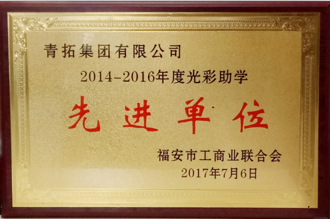 7月6日,福安市工商业联合会授予青拓集团有限公司“2014-2016年度光彩助学先进单位”荣誉称号,表彰企业积极参与“光彩助学”公益活动,助力一批又一批的贫困学子走上求学之路,圆了大学梦,完成大学学业,使他们感受到了社会的温暖、人间的真情。